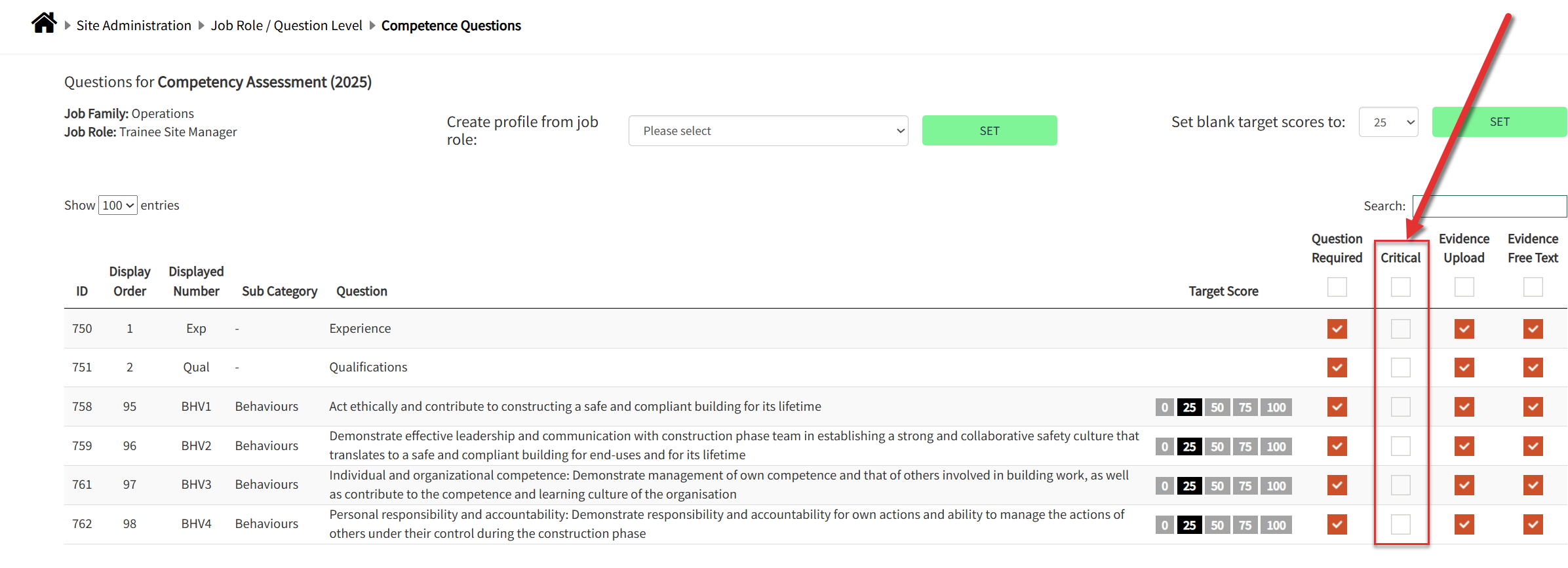 NOTE: If you are looking to make a question or set of questions critical for every job role then it will be quicker for our admin team to add this in the back-end. Please contact your support manager to arrange this.