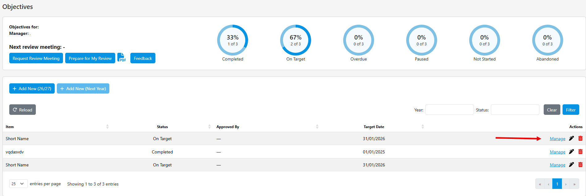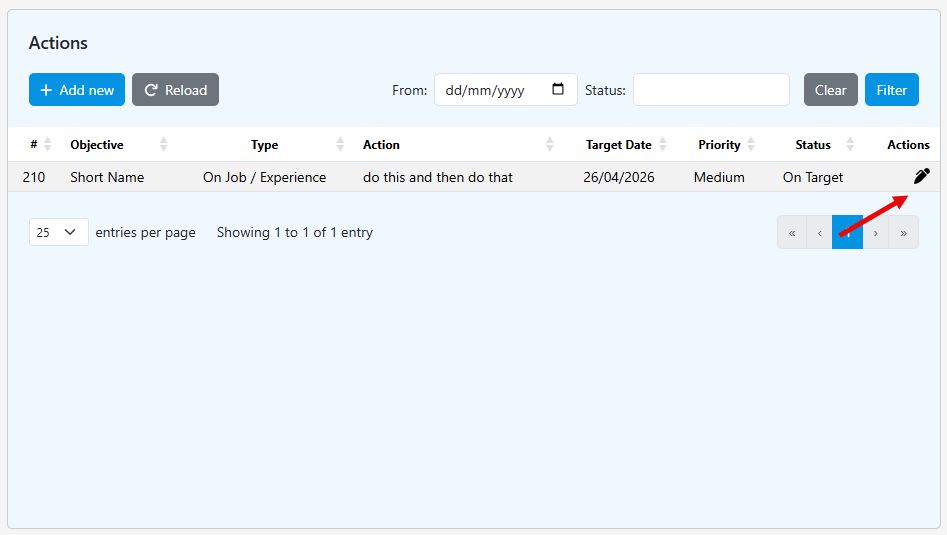 6. Amend the existing Objective by clicking on the edit symbol under Actions