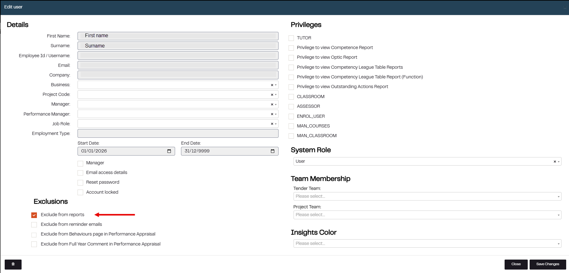 4. Click on the box to the left of Exclude from reports