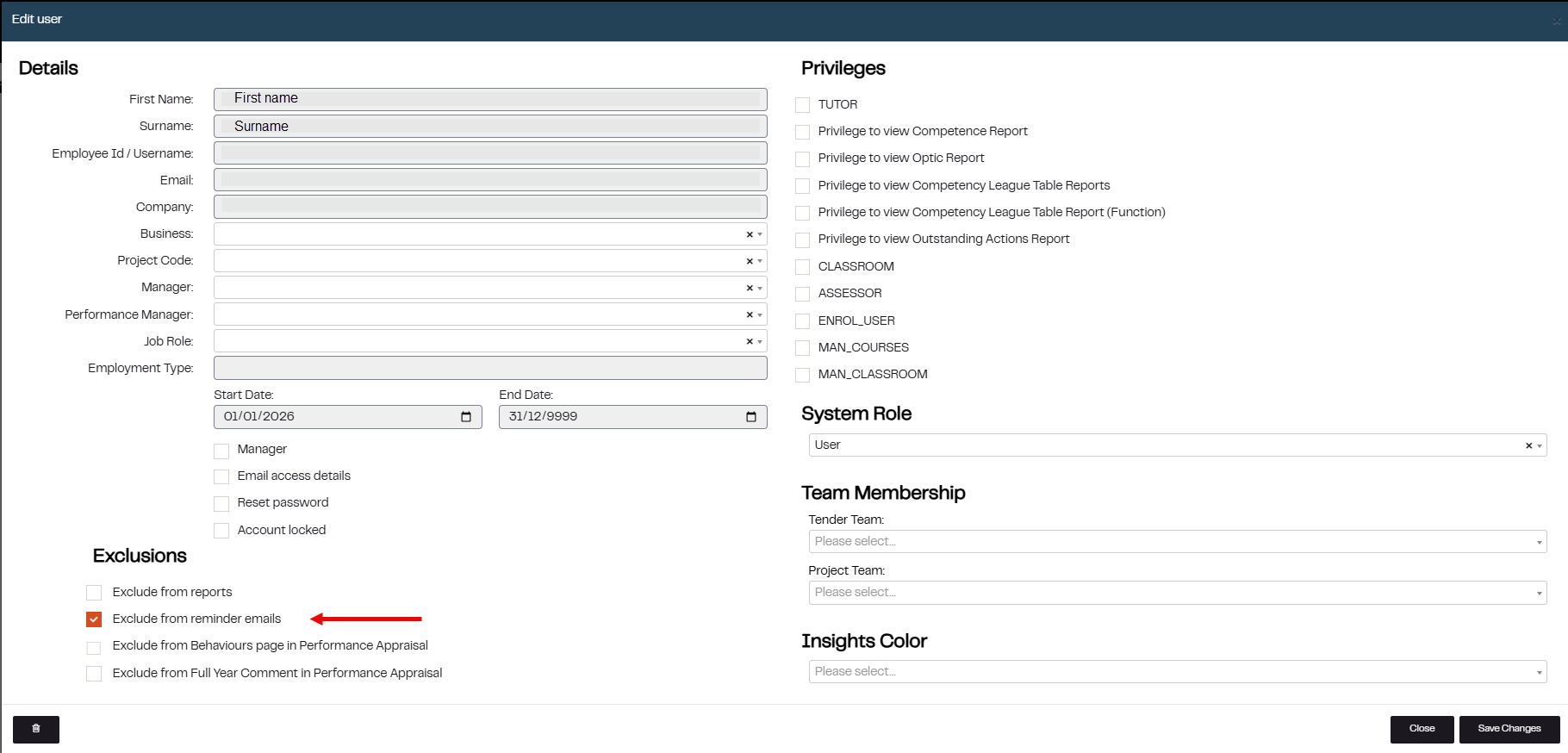 4. Click on the box to the left of Exclude from reminder emails