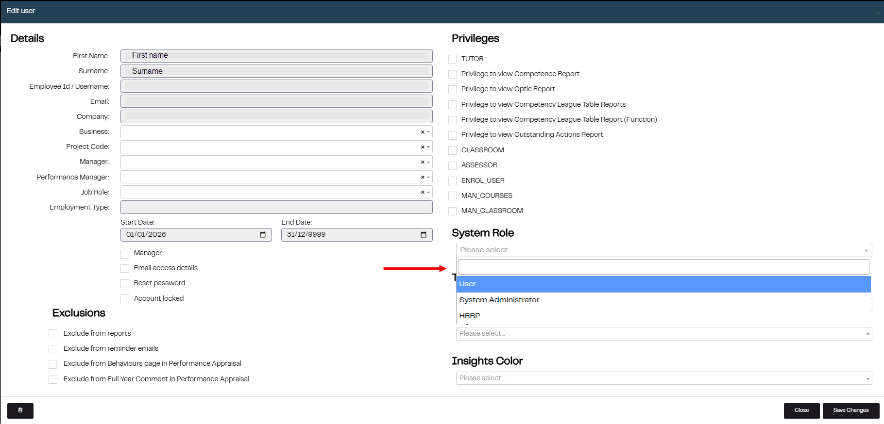 4. Click on the dropdown box under System Role and choose the correct System Role for the Employee