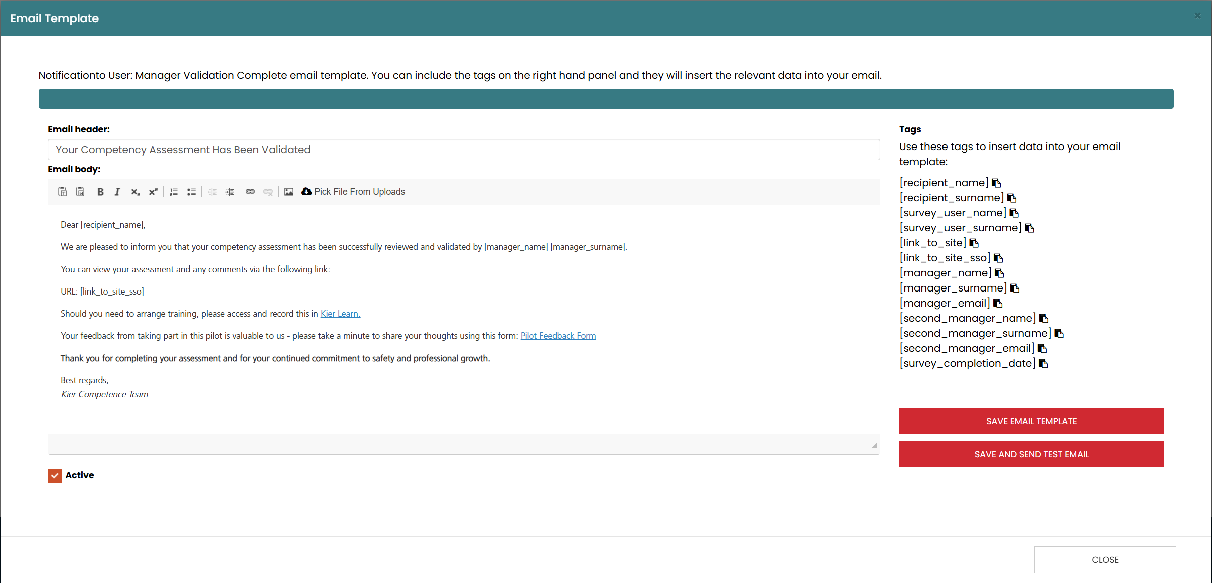 Amend the email content and add/amend tags by copying the tags that you wish to insert and paste into the required place in the email.